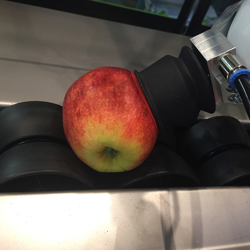 Las frutas entran en el robot mediante una cinta transportadora, girando en la unidad cónica del mecanismo de embalaje. La máquina reconoce la coloración y la orientación, de modo que el brazo de recogida robótico puede colocarlas en la posición adecuada. A continuación, se comprueba que encaje en la bandeja correspondiente antes de colocarla con la coloración roja hacia arriba y con la orientación del cáliz/tallo elegida.