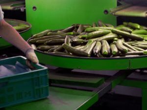 Vegetables such as tomatoes, cucumbers and peppers can be filled automatically to the required weight or number in bins or crates in a very friendly and efficient manner, after which the box or crate can be discharged either manually or automatically as required. For cucumbers we have a unique, patented solution for filling boxes very efficiently.